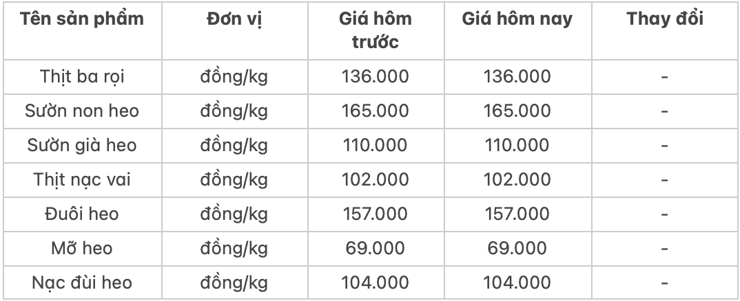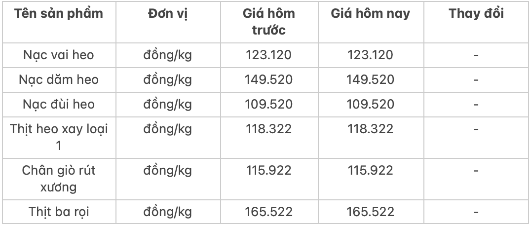 Theo đó, nạc dăm heo có giá 149.520 đồng/kg và ba rọi heo có giá 165.522 đồng/kg. Thấp hơn là giá hai sản phẩm thịt heo xay và nạc vai heo, lần lượt niêm yết tại mức 118.322 đồng/kg và 123.120 đồng/kg.