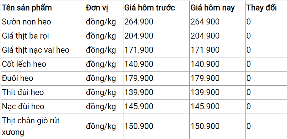 Giá thịt heo hôm nay (16/12) tại cửa hàng VinMart và Công ty Thực phẩm bán lẻ tiếp tục không xuất hiện điều chỉnh so với ngày hôm trước. Hiện mức giá đang bán dao động trong khoảng 139.900 - 264.900 đồng/kg tại VinMart.