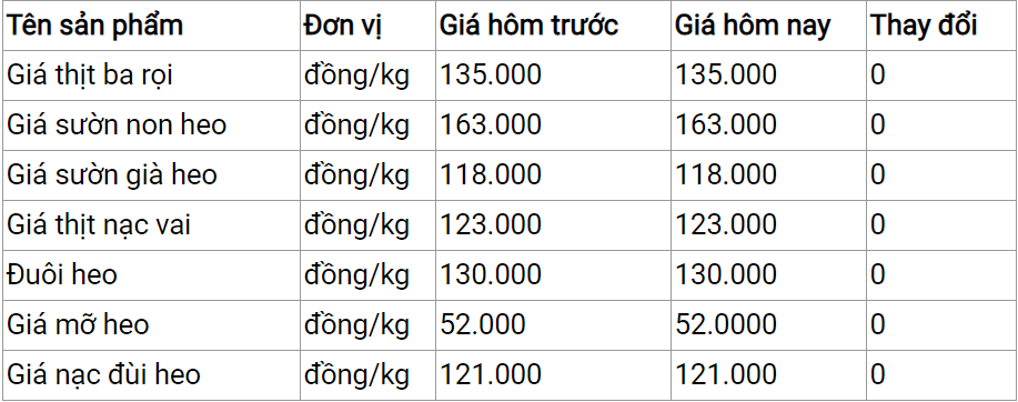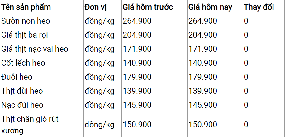 Giá thịt heo hôm nay 24/12 tại cửa hàng VinMart và Công ty Thực phẩm bán lẻ tiếp tục duy trì mức ổn định, không có nhiều thay đổi so với những ngày trước đó.