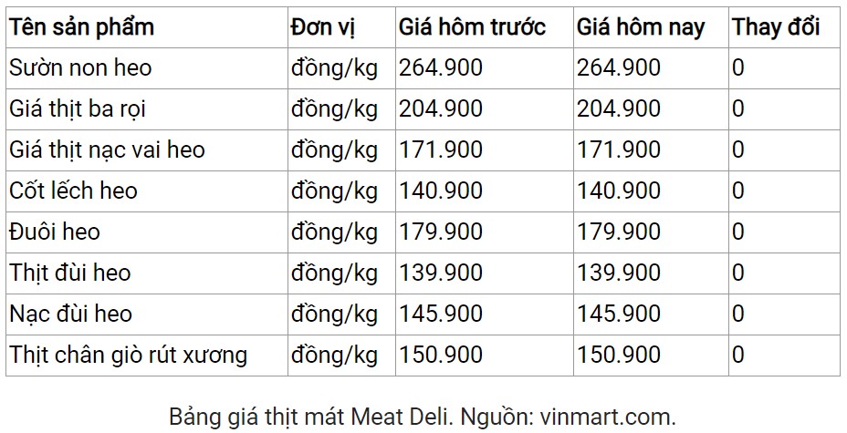 Hôm nay (26/2), giá thịt heo mát Meat Deli từ trang vinmart.com vẫn duy trì ổn định.