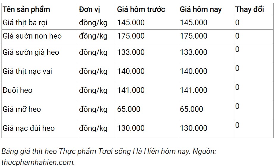 Hôm nay giá thịt heo tại Công ty Thực phẩm Tươi sống Hà Hiền hiện vẫn không xuất hiện điều chỉnh.