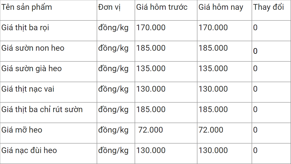 Giá thịt heo hôm nay ghi nhận duy trì mức giá ổn định so với các phiên giao dịch trước khi mà hầu hết các sản phẩm thịt heo đều chưa có sự biến động về giá. Duy chỉ có Công ty Thực phẩm bán lẻ có chút thay đổi khi giá heo hơi đang dần hạ nhiệt.
