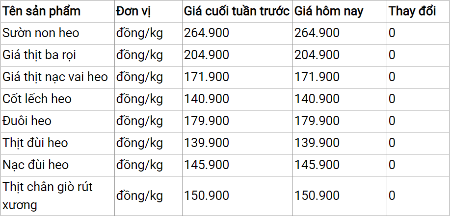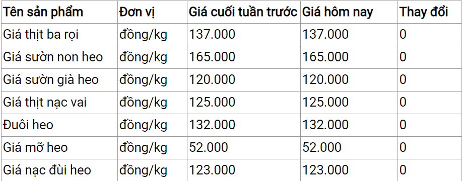 Giá thịt heo tại Công ty Thực phẩm Tươi sống Hà Hiền không xuất hiện điều chỉnh so với cuối tuần trước . Hiện mức giá bán đang dao động trong khoảng 52.000 - 165.000 đồng/kg. Trong đó, thịt ba rọi và đuôi heo hiện đang bán với giá lần lượt là 137.000 đồng/kg và 132.000 đồng/kg.