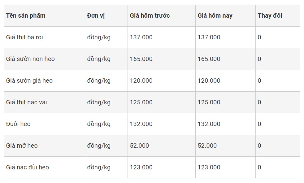 Trong đó, thịt ba rọi và đuôi heo hiện đang bán với giá lần lượt là 137.000 đồng/kg và 132.000 đồng/kg.