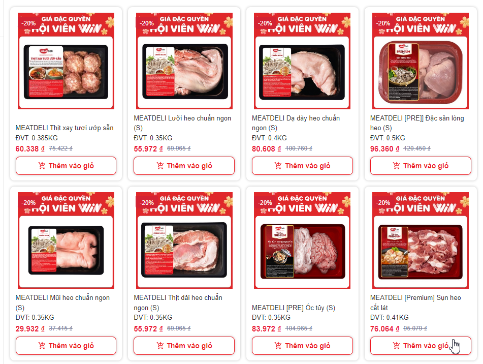 Hiện, các sản phẩm thịt heo có giá bán trong khoảng 92.720 - 155.922 đồng/kg, trong đó các loại đang được giảm giá 20% theo chương trình ưu đãi dành cho hội viên của WinMart.