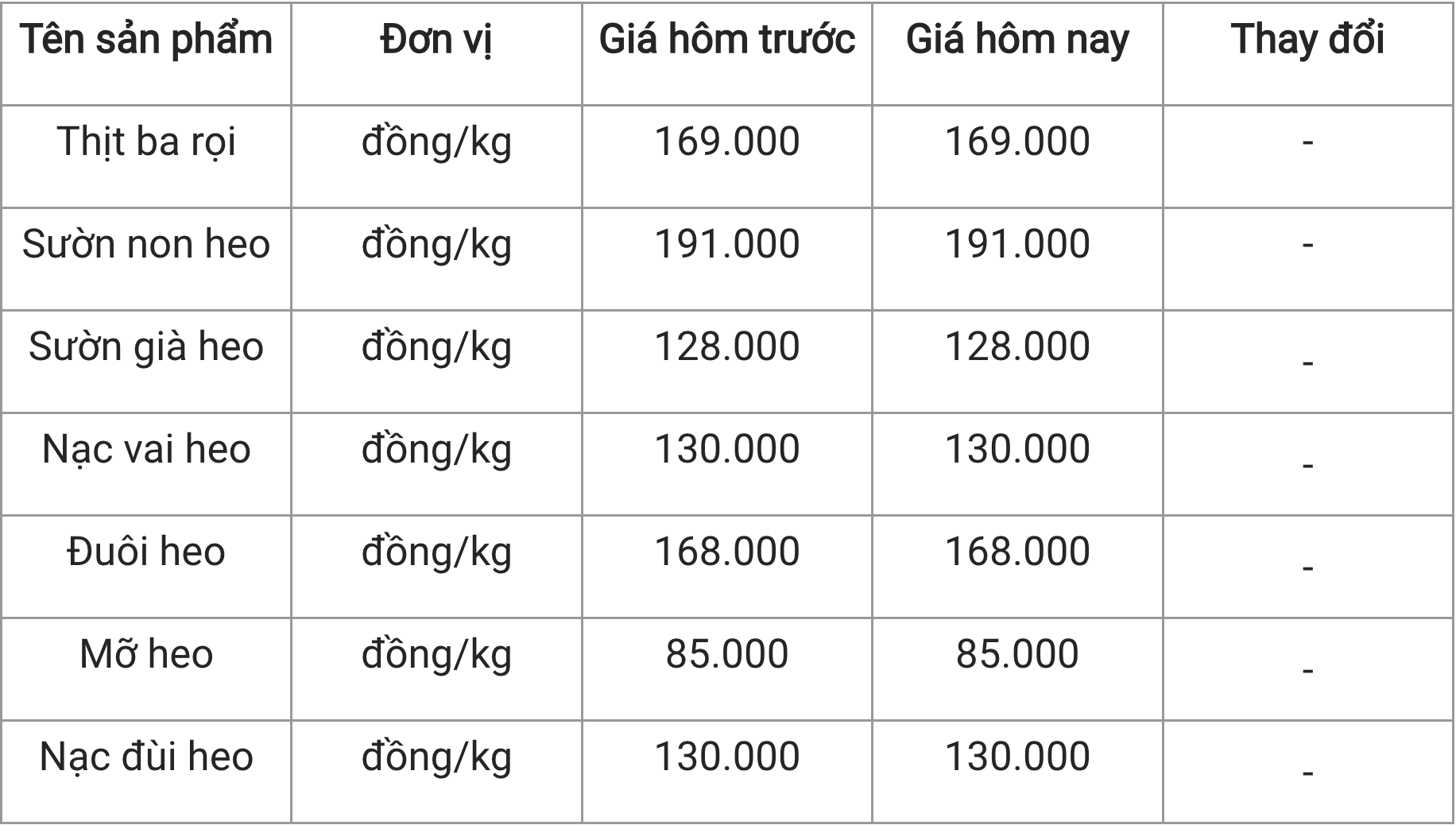 Các sản phẩm thịt heo tại Công ty Thực phẩm Tươi sống Hà Hiền đang có giá bán như sau: nạc vai heo và nạc đùi heo 130.000 đồng/kg, sườn non heo 191.000 đồng/kg, sườn già heo 128.000 đồng/kg, ba rọi heo 169.000 đồng/kg, mỡ heo 85.000 đồng/kg, đuôi heo 168.000 đồng/kg.