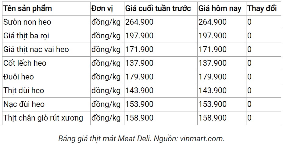 Hôm nay (5/4), giá thịt heo mát Meat Deli từ trang vinmart.com thị trường tiếp tục ổn định so với cuối tuần trước.