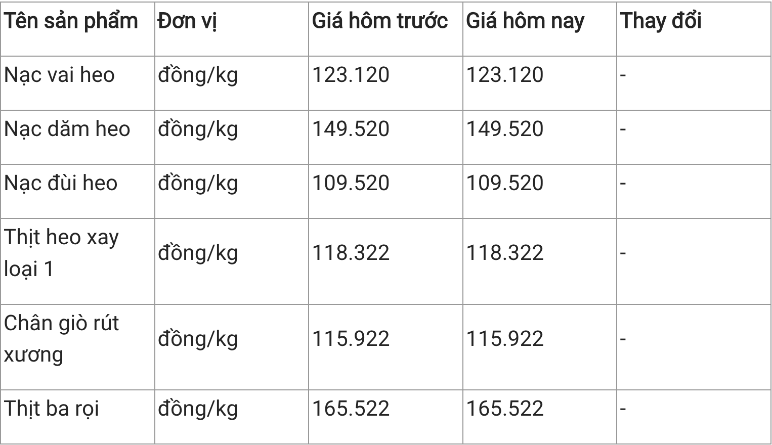 Theo ghi nhận, thịt nạc đùi heo có giá thấp nhất trong các sản phẩm được khảo sát, bán ra tại mức 109.520 đồng/kg. Ở chiều ngược lại, thịt ba rọi là sản phẩm có giá bán cao nhất, đạt 165.522 đồng/kg.