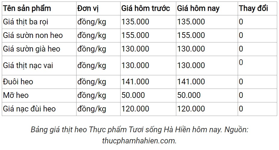 Giá thịt heo hôm nay tại Công ty Thực phẩm Tươi sống Hà Hiền thị trường tiếp tục không xuất hiện điều chỉnh.