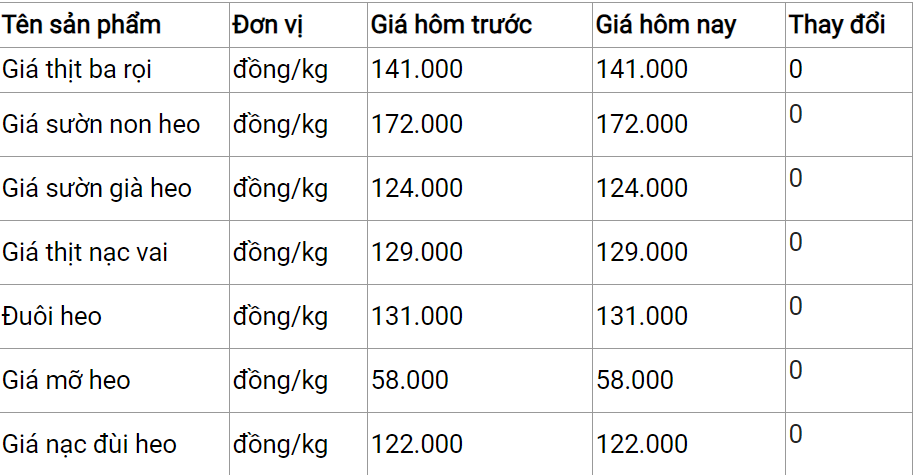 Giá thịt heo tại Công ty Thực phẩm Tươi sống Hà Hiền hiện không xuất hiện thay đổi so với ngày hôm trước. Mức giá đang bán dao động trong khoảng 58.000 - 172.000 đồng/kg.