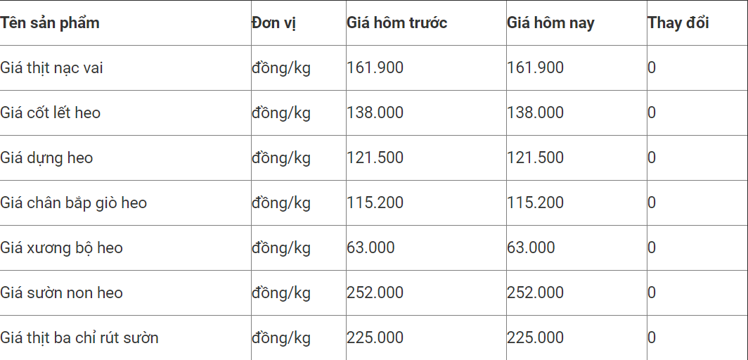 Giá thịt heo Vissan, Công ty Thực phẩm bán lẻ hay thịt mát Meat Deli đều không xuất hiện thay đổi so với ngày hôm qua 9/6.