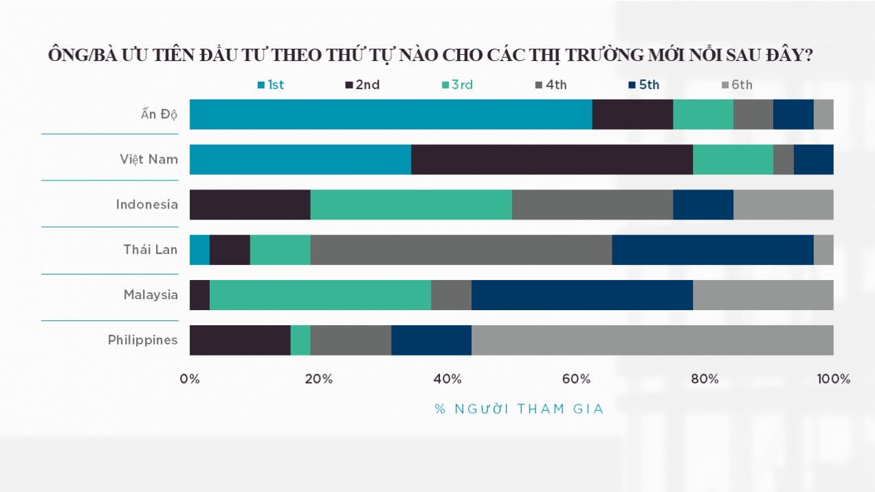 Cuộc khảo sát thường niên của Cushman & Wakefield với các khách hàng hàng đầu toàn cầu vào năm 2022 cho thấy, Ấn Độ được hơn 60% số người được hỏi xếp hạng là thị trường mới nổi ưa thích của họ (trừ Trung Quốc đại lục) để đầu tư. Trên cơ sở ưu tiên thứ nhất và thứ hai, Việt Nam là thị trường mới nổi được lựa chọn, chiếm gần 80% số phiếu bầu, vượt xa 75% của Ấn Độ.
