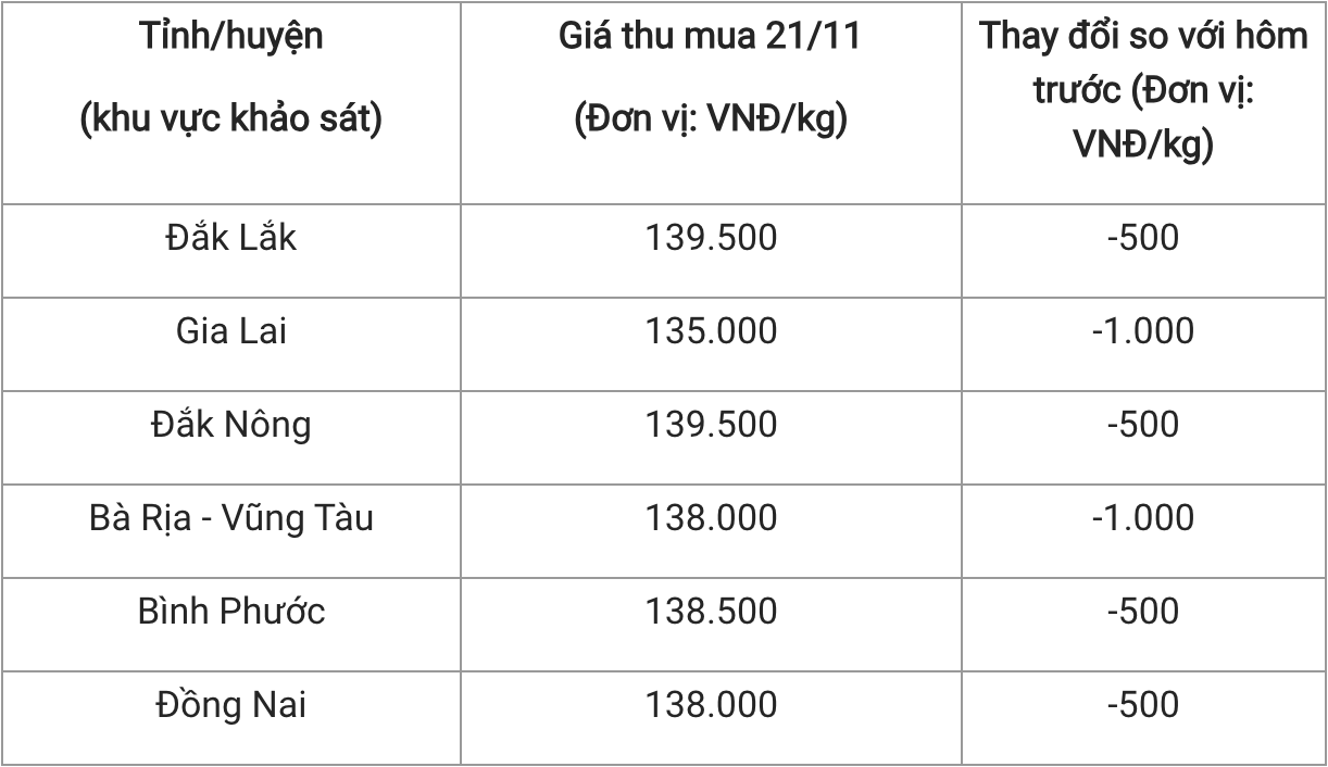 Còn tại tỉnh Gia Lai và tỉnh Bà Rịa – Vũng Tàu, giá tiêu giảm đến 1.000 đồng/kg về mốc 138.000 đồng/kg. Đây cũng là giá thu mua tại Đồng Nai, giảm 500 đồng/kg so với ngày hôm qua.