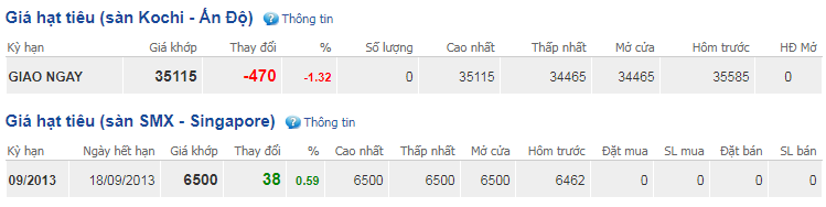 Hôm nay 3/12/2019 lúc 9h, giờ Việt Nam, giá tiêu thế giới giao ngay tại sàn Kochi Ấn Độ, giá hạt tiêu đen xuất khẩu giảm 1,32%, giá tiêu thế giới giao ngay tại sàn Kochi (Ấn Độ) ở mức 35.115 Rupi/tạ. Giá tiêu giao tháng 11/2019 đi ngang ở ngưỡng 34.033 Rupi/tạ. Giá hạt tiêu trên (sàn SMX - Singapore) tháng 9 vẫn ổn định ở mức 6.500 USD/tấn.