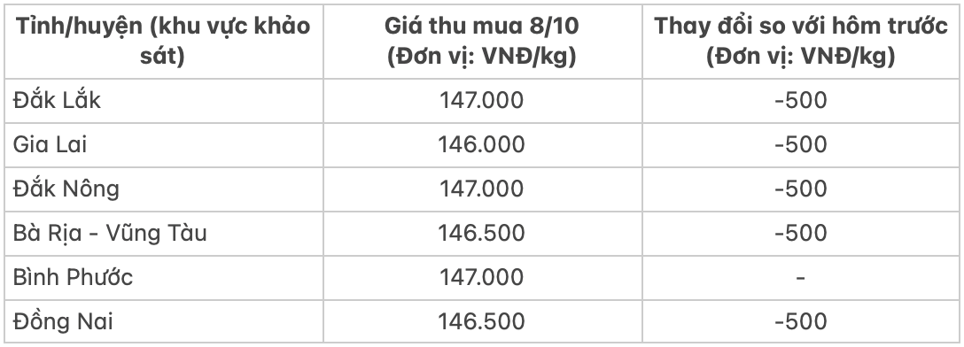 Trong khi đó, Bình Phước là địa phương duy nhất có giá đi ngang ở mức 147.000 đồng/kg.