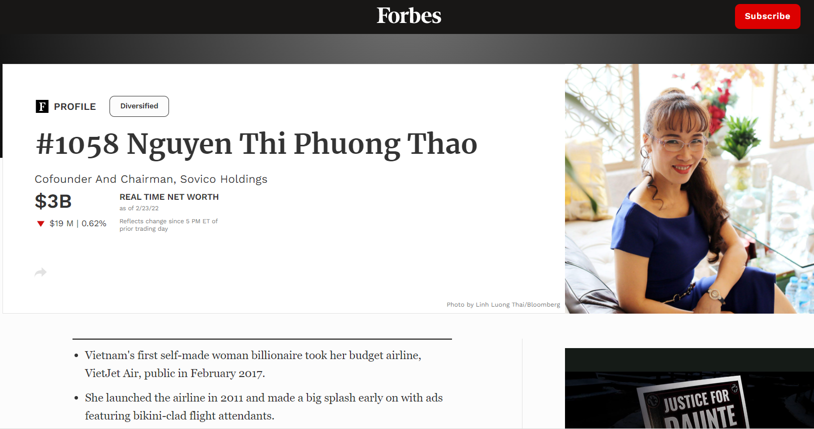 Tính đến ngày 23/2/2022, Forbes ước tính tài sản ròng của tỉ phú Nguyễn Thị Phương Thảo đạt 3 tỉ USD.