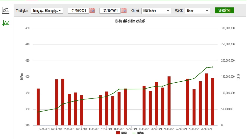 Tháng 10/2021, HNX INdex tăng 15,33%, giá trị vốn hóa tăng 6,18%