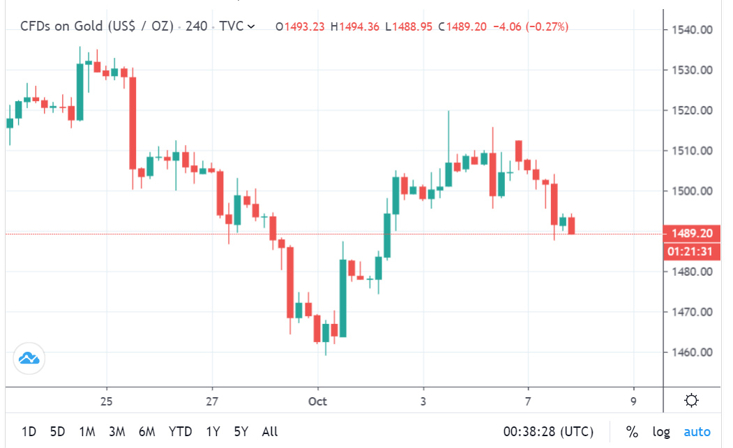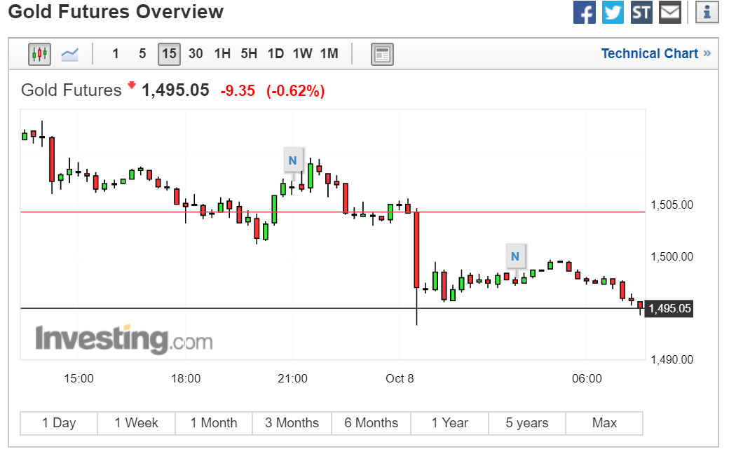 Sáng nay (08/10), giá vàng giao ngay trên sàn giao dịch châu Á giao dịch ở mức 1.492 USD/ounce, giảm 2.34 USD/ounce, tương đương mức giảm 0,15% so với phiên giao dịch trước đó. Giá vàng tương lai giao tháng 12/2019 giảm giá còn 1.496 USD/ounce, giảm 8,30 USD/ounce, tương đương mức giảm 0.55%.