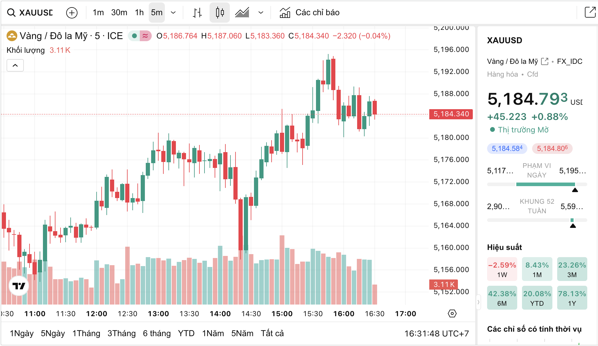 Trên thị trường quốc tế, giá vàng giao ngay tiếp tục duy trì ở vùng cao. Theo dữ liệu từ Kitco lúc 16 giờ 25 phút ngày 10/3 (giờ Việt Nam), vàng giao ngay được giao dịch quanh 5.184 USD/ounce, tăng khoảng 0,88% so với phiên trước. Trong phiên, giá vàng dao động trong khoảng 5.119 – 5.187 USD/ounce, cho thấy mức biến động khá mạnh.