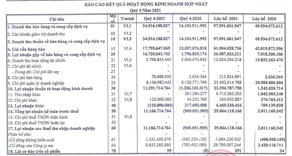 Lũy kế cả năm 2021, Petroland ghi nhận doanh thu thuần đạt gần 98 tỷ đồng, tăng 96% so với cùng kỳ. Lợi nhuận sau thuế đạt 29,8 tỷ đồng, tăng gần 15 lần so với 2 tỷ đồng lợi nhuận thu về trong năm 2020.
