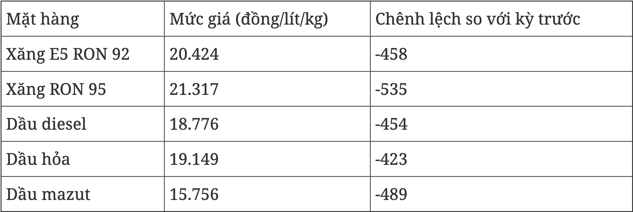 Giá dầu điêzen 0.05S giảm 454 đồng/lít, xuống còn 18.776 đồng/lít; Dầu hỏa giảm 423 đồng/lít, xuống còn 19.149 đồng/lít; Dầu madút 180CST 3.5S giảm 489 đồng/kg, còn 15.756 đồng/kg.