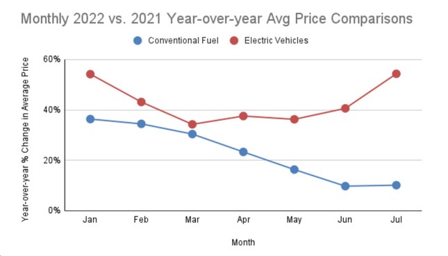 Theo báo cáo của tổ chức dữ liệu iSeeCars.com, sau khi phân tích giá thành của gần 14 triệu chiếc xe đã qua sử dụng từ 1-5 năm, họ phát hiện ra rằng vào tháng 7/2022, giá trung bình của ô tô thuần điện đã tăng 54,3% so với cùng kỳ năm ngoái. Trong khi đó, ô tô cũ sử dụng động cơ đốt trong có giá trung bình tăng 10,1%.