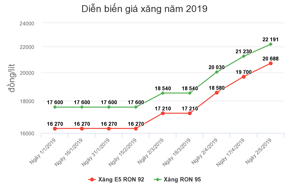 | Diễn biễn giá xăng E5 RON 92 và RON 95 trong năm 2019 (Ảnh VnExpress) |