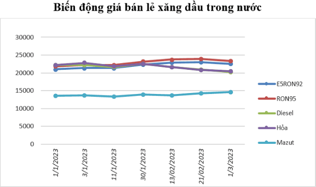 So với chu kỳ trước, bình quân giá dầu diesel từ 1-9/3 tăng 4,026 USD/thùng, dầu hỏa tăng 2,775 USD/thùng, dầu mazut tăng 32,434 USD/tấn.