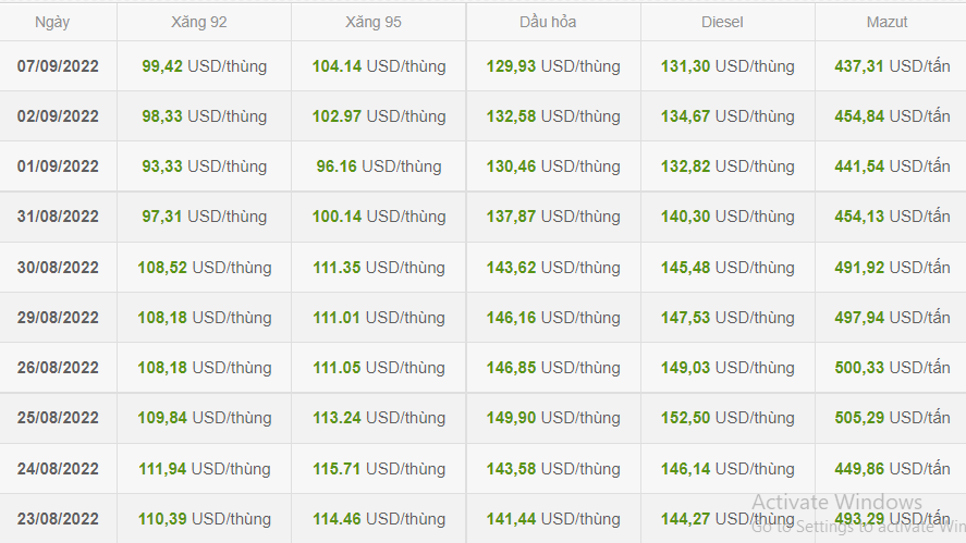 Trong khi đó, dữ liệu cập nhật của Bộ Công Thương ngày 7/9 cho thấy, giá xăng nhập A95 nhập từ Singapore ở mức 104,14 USD/thùng, xăng A92 ở mức 999,4 USD/thùng, dầu diesel ở mức 131,3 USD/thùng. Mức giá này so với thời điểm 31/8 thì tăng nhẹ ở mặt hàng xăng song giảm mạnh ở dầu diesel.