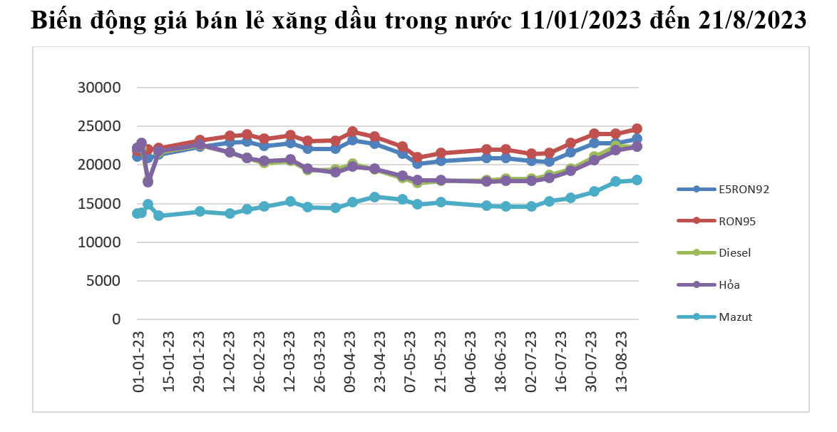 Như vậy, đây là lần tăng giá xăng lần thứ 5 liên tiếp của giá xăng trong nước trong thời gian gần đây. Tại phiên điều hành chiều 11/8 của Liên bộ Tài chính - Công Thương trước đó, giá xăng RON95 ở mức 23.990 đồng/lít, xăng E5 RON92 là 22.820 đồng/lít; giá dầu diesel là 22.420 đồng/lít; giá dầu hỏa là 21.880 đồng/lít.