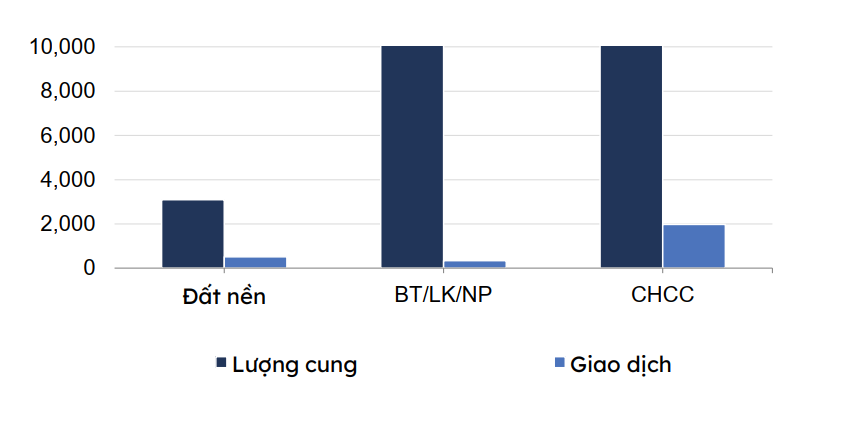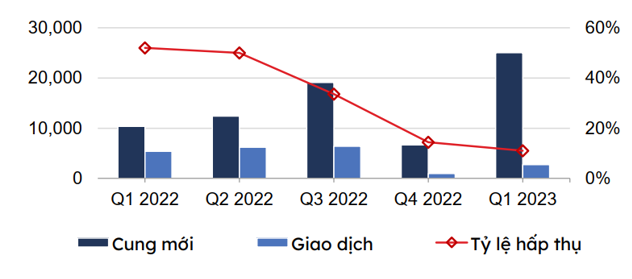 Nguồn cung ra thị trường quý 1 năm 2023 đạt khoảng 25.000 sản phẩm, chủ yếu là hàng tồn kho từ các dự án mở bán trước đó. Tỷ lệ hấp thụ trong quý 1 năm 2023 chỉ đạt khoảng 11%, tương đương hơn 2.700 giao dịch, giảm hơn 50% so với cùng kỳ năm ngoái.
