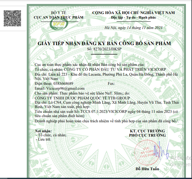Giấy tiếp nhận đăng ký công bố sản phẩm cho sản phẩm Thực phẩm bảo vệ sức khỏe NaT. Slim do Công ty TNHH Dược phẩm Quốc tế TTB GROUP sản xuất.