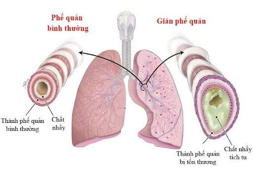 Giãn phế quản là tình trạng đường dẫn khí của phổi bị giãn rộng và phá hủy các phế quản lớn do nhiễm trùng và viêm mạn tính. Những đường dẫn khí bị hư hỏng này tạo điều kiện cho vi khuẩn và chất nhầy tích tụ và đọng lại trong phổi. Điều này dẫn đến tình trạng nhiễm trùng thường xuyên và tắc nghẽn đường thở.