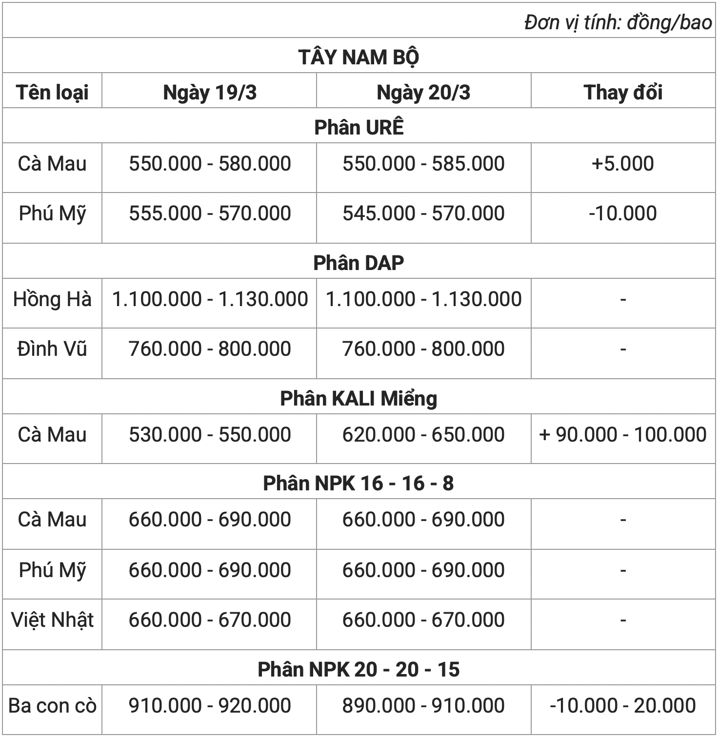 Mặt khác, giá phân bón hôm nay (20/3) tại khu vực Tây Nam Bộ tăng giảm không đồng nhất.