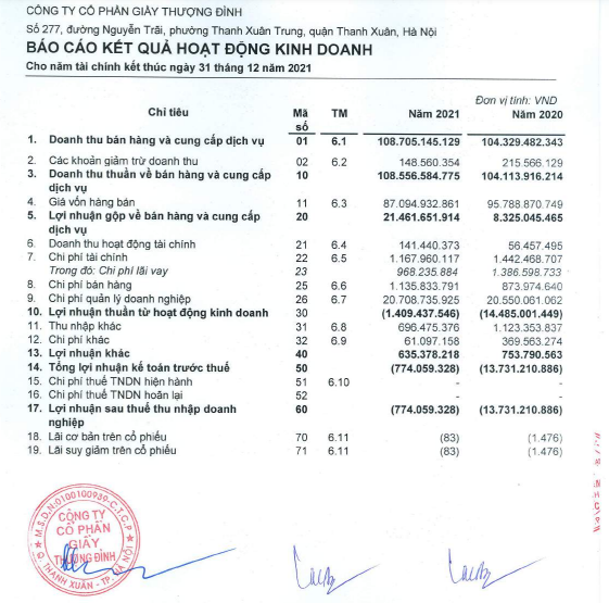 Kết quả kinh doanh năm 2021 của Giày Thượng Đình.