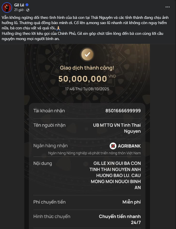 Kèm theo đó Gil Lê đăng ảnh chụp màn hình số tiền 50 triệu đồng đến Ủy ban Mặt trận Tổ quốc Việt Nam - tỉnh Thái Nguyên. Dòng trạng thái này đang nhận về hàng nghìn lượt tương tác, chia sẻ và bình luận.
