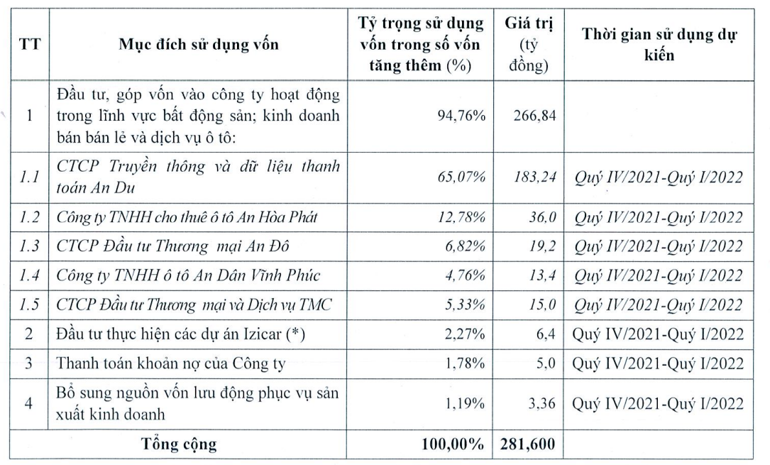 Tổng số tiền dự kiến thu về sau đợt chào bán là 281,6 tỷ đồng được dùng để đầu tư, góp vốn vào công ty hoạt động trong lĩnh vực bất động sản, kinh doanh bán lẻ và dịch vụ ô tô, đầu tư thực hiện dự án Izicar, thanh toán khoản nợ của Công ty và bổ sung nguồn vốn lưu động phục vụ sản xuất kinh doanh.