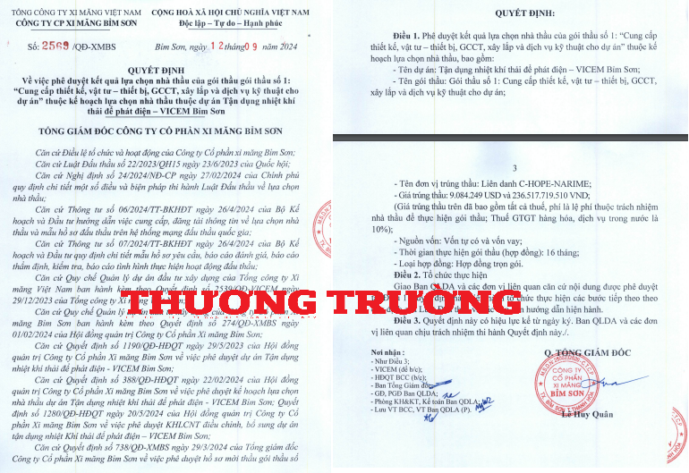 Ông Lê Huy Quân, Q. Tổng giám đốc Vicem Bỉm Sơn đã ký Quyết định số 2569/QĐ-XMBS duyệt cho liên danh C-HOPE-NARIME trúng thầu gói thầu này.
