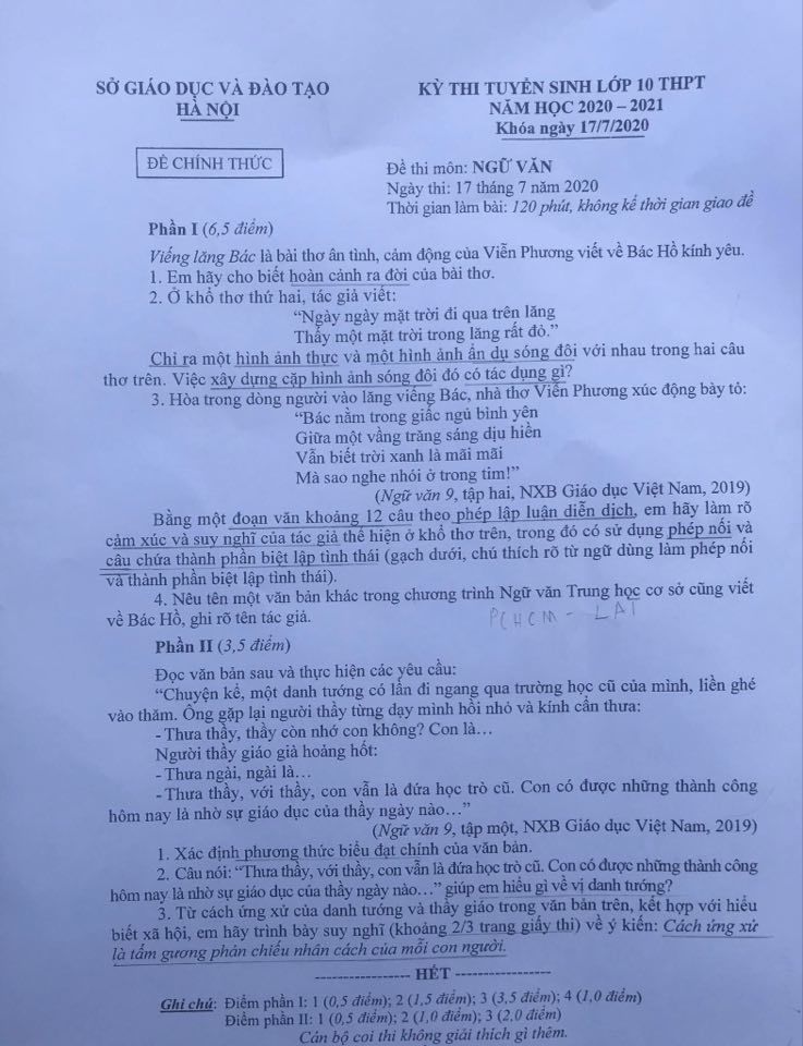 Đề thi chính thức môn Ngữ văn vào lớp 10 tại Hà Nội năm 2020