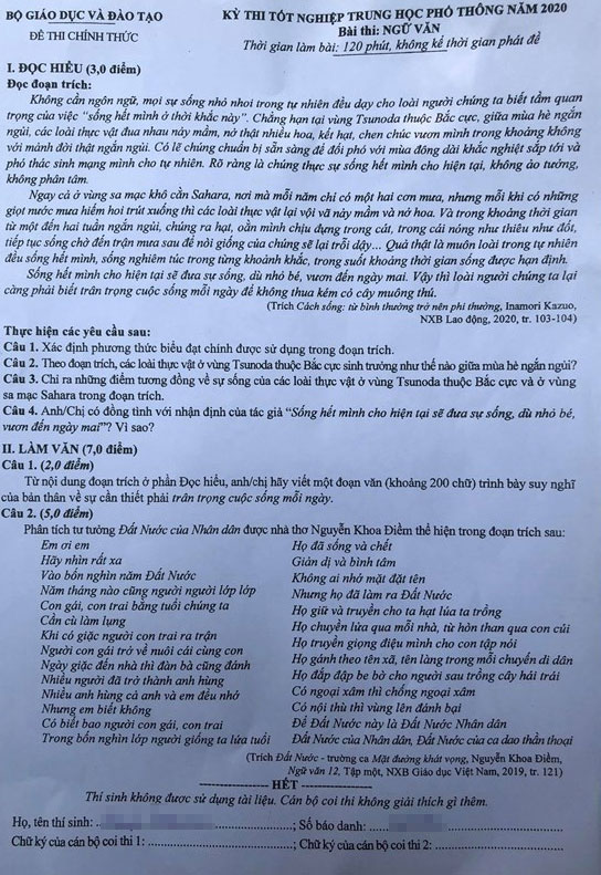 Đề thi môn Ngữ văn tốt nghiệp THPT 2020