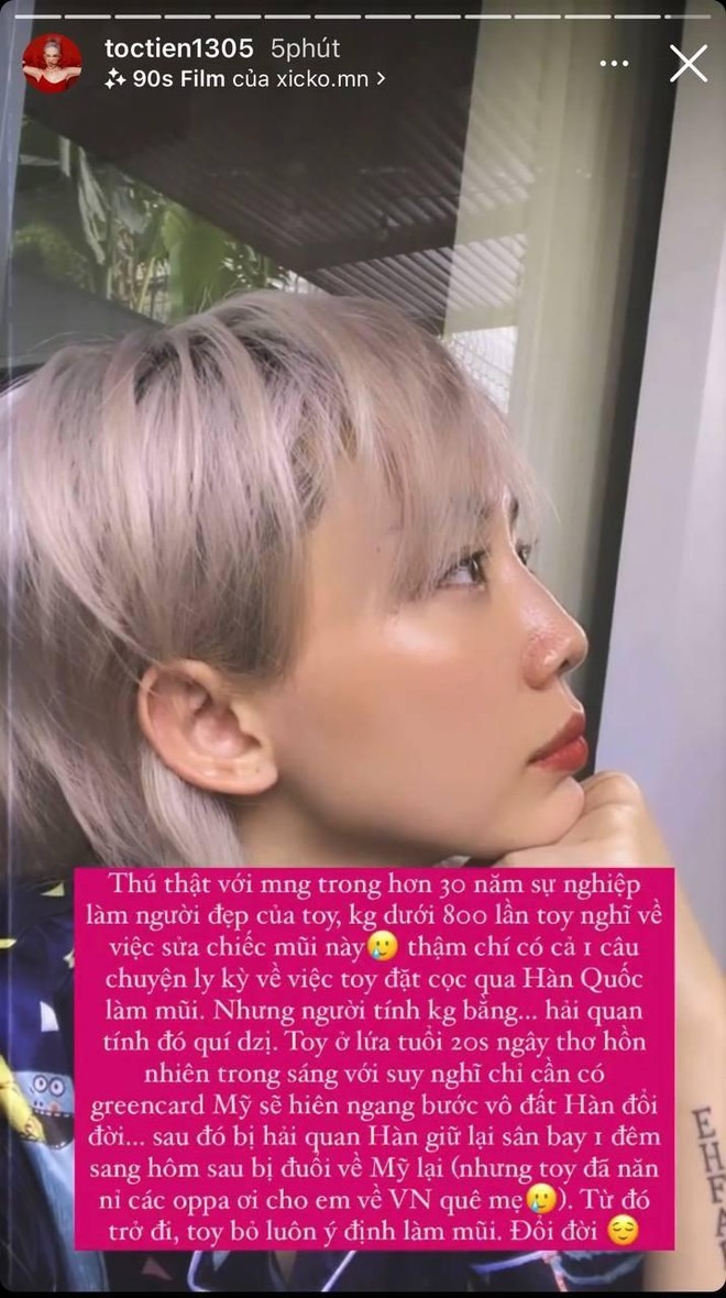 "Thú thật với mọi người, trong hơn 30 năm sự nghiệp làm người đẹp của tôi, không dưới 800 lần tôi nghĩ về việc sửa chiếc mũi này, thậm chí có cả một câu chuyện ly kỳ về việc tôi đặt cọc qua Hàn Quốc làm mũi. Nhưng người tính không bằng... hải quan tính đó quý vị. Tôi ở lứa tuổi 20 ngây thơ hồn nhiên trong sáng với suy nghĩ chỉ cần có thẻ xanh Mỹ sẽ hiên ngang bước vô đất Hàn đổi đời. Sau đó bị hải quan Hàn giữ lại sân bay một đêm, sáng hôm sau bị đuổi về Mỹ lại. Từ đó trở đi tôi bỏ luôn ý định làm mũi", bà xã của Hoàng Touliver kể lại trải nghiệm nhớ đời của bản thân.