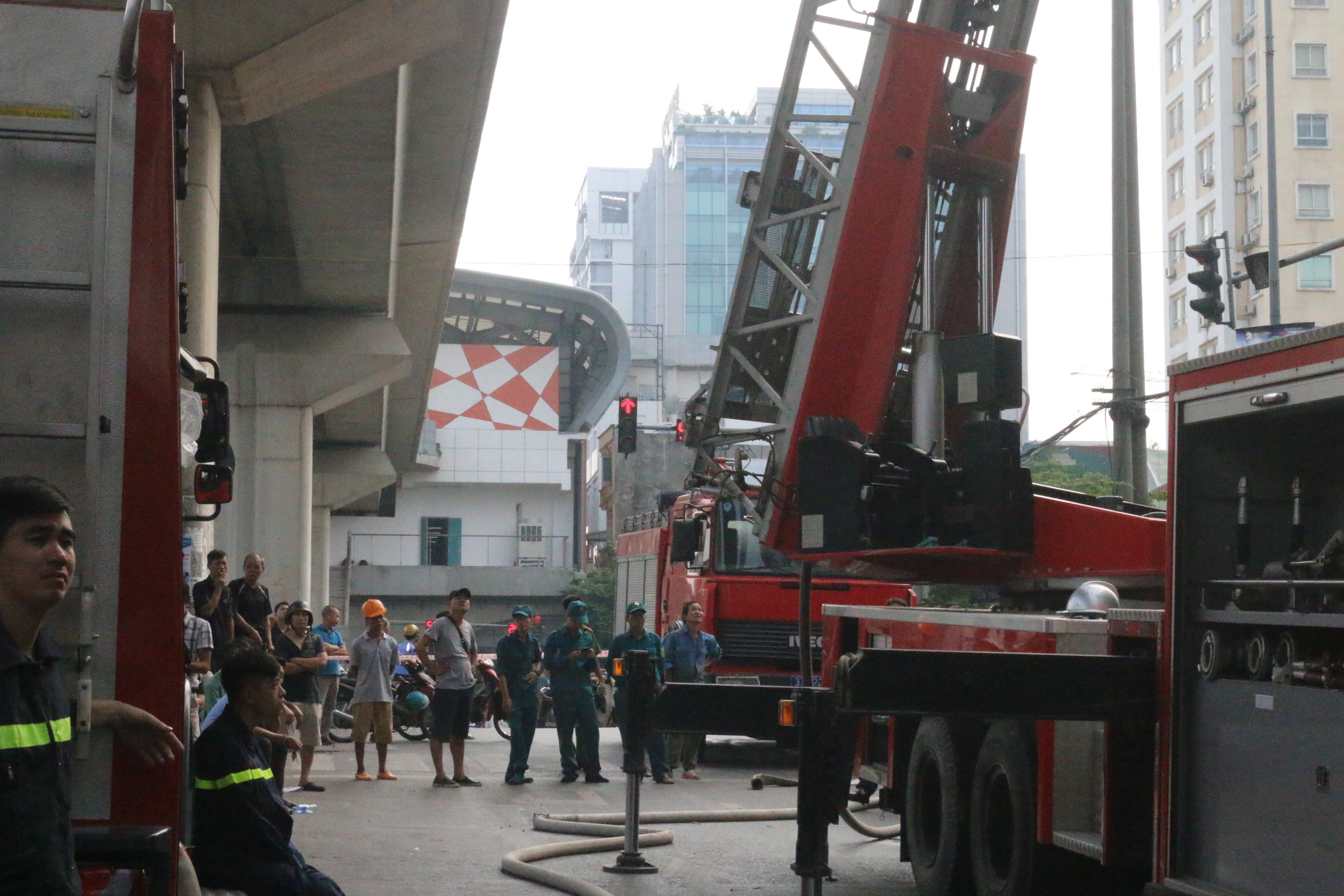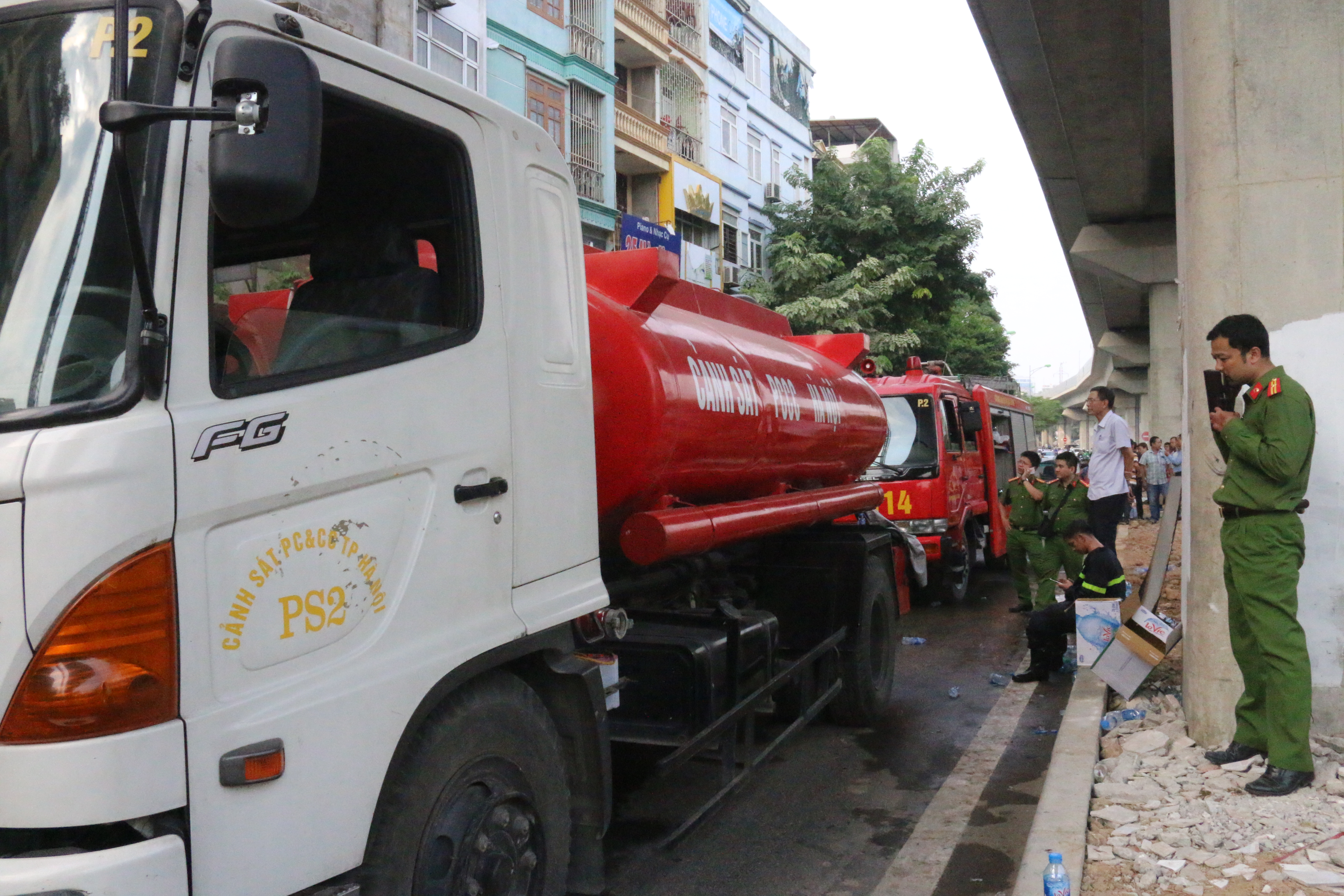 | Gần chục chiếc xe cứu hỏa cùng lực lượng chức năng đã có mặt để xử lý đám cháy. |