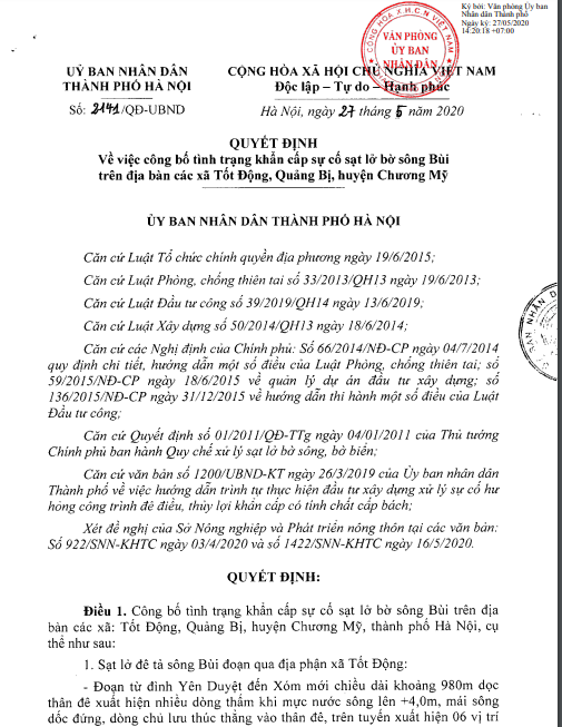 Văn bản của UBND TP Hà Nội về việc công bố tình trạng khẩn cấp vì sạt lở ở 3 huyện ngoại thành.