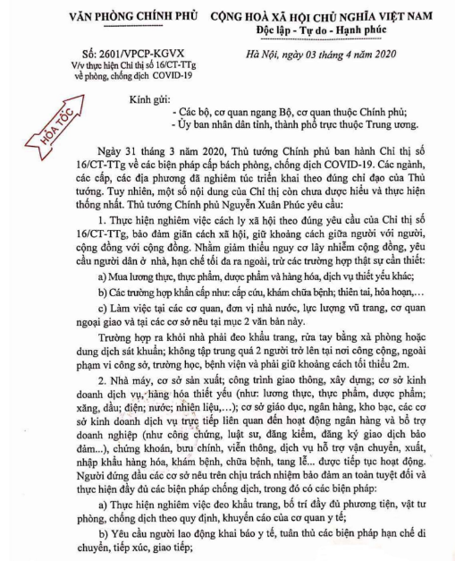 Ngày 3/4, Thủ tướng Chính phủ đã có Công văn số 2601/VPCP-KGVX về việc thực hiện Chỉ thị số 16/CT-TTg về phòng, chống dịch COVID-19. Theo đó, Công văn nêu rõ 5 yêu cầu của Thủ tướng về việc thực hiện các biện pháp cấp bách phòng chống dịch bệnh COVID-19.