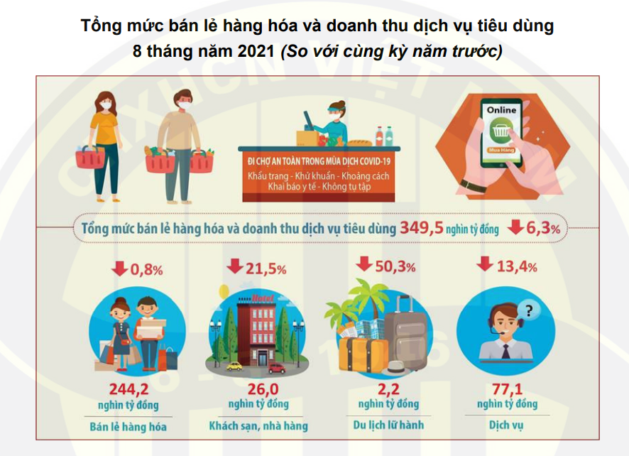 Tính chung 8 tháng năm 2021, tổng mức bán lẻ hàng hóa và doanh thu dịch vụ tiêu dùng ước tính đạt 349,5 nghìn tỷ đồng, giảm 6,3% so với cùng kỳ năm trước.