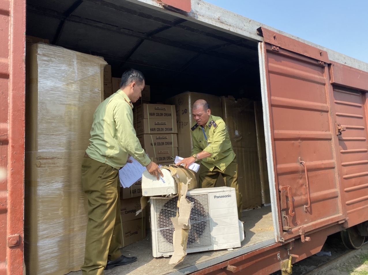 Cục QLTT thành phố Hà Nội khám toa tàu số 232058 HN khi đang dừng, đỗ xếp dỡ hàng hóa, phát hiện hàng trăm cục điều hòa, tủ lạnh có dấu hiệu nhập lậu.