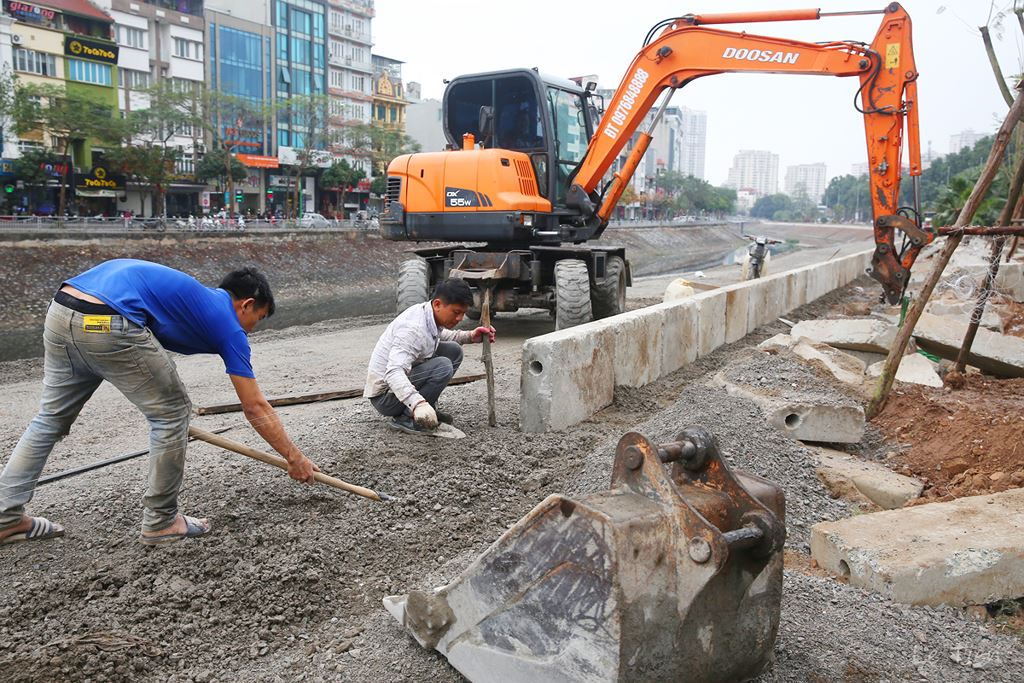 Trên công trường, công nhân đang hối hả bó vỉa phần đường dành cho người đi bộ và xe thô sơ. Ảnh: Lê Tiên |