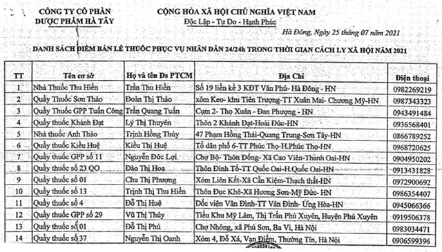 Sở Y tế Hà Nội vừa công bố 76 điểm bán lẻ thuốc phục vụ người dân trong những ngày Hà Nội thực hiện giãn cách theo Chỉ thị số 17/CT-UBND của Chủ tịch UBND thành phố Hà Nội.