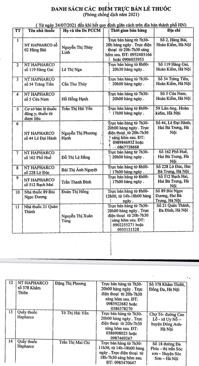 Sở Y tế Hà Nội đề nghị, các bệnh viện trực thuộc ngành Y tế Thủ đô, Công ty cổ phần Dược phẩm và Thiết bị y tế Hà Nội, Công ty cổ phần Dược phẩm Hà Tây tăng cường nguồn cung, dự trữ đầy đủ thuốc. Đồng thời, các nhà thuốc, quầy thuốc bố trí cán bộ trực bán thuốc 24/24 giờ để phục vụ người dân trong những ngày thực hiện giãn cách xã hội.