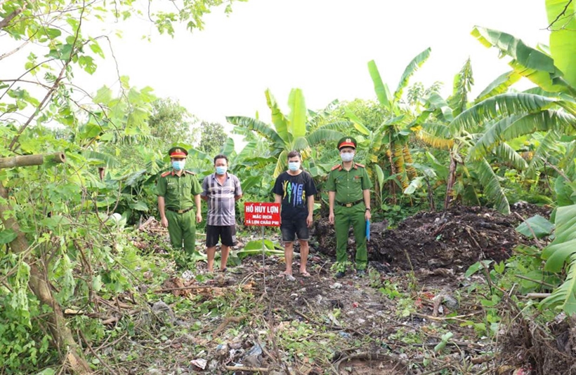 2 đối tượng mua bán thịt lợn bệnh tại khu vực tiêu hủy. Ảnh: CAHN